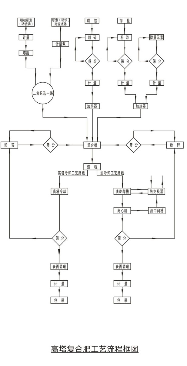工藝原理固體尿素或硝銨(硝銨磷等)通過(guò)熔融器加熱熔融后成為熔融液,也可以直接使用蒸發(fā)濃縮后的液態(tài)尿液(硝銨)液中加入相應(yīng)的磷肥、鉀肥、填料及添加劑制成 混合料漿。混合料漿進(jìn)入高塔造粒設(shè)備進(jìn)行噴灑造粒,物料在從高塔下降過(guò)程中,與塔底上升氣流阻力相互作用,與其進(jìn)行熱交換后降落到塔底,落入塔底的物料,經(jīng)篩分表面處理后得到顆粒復(fù)合肥。